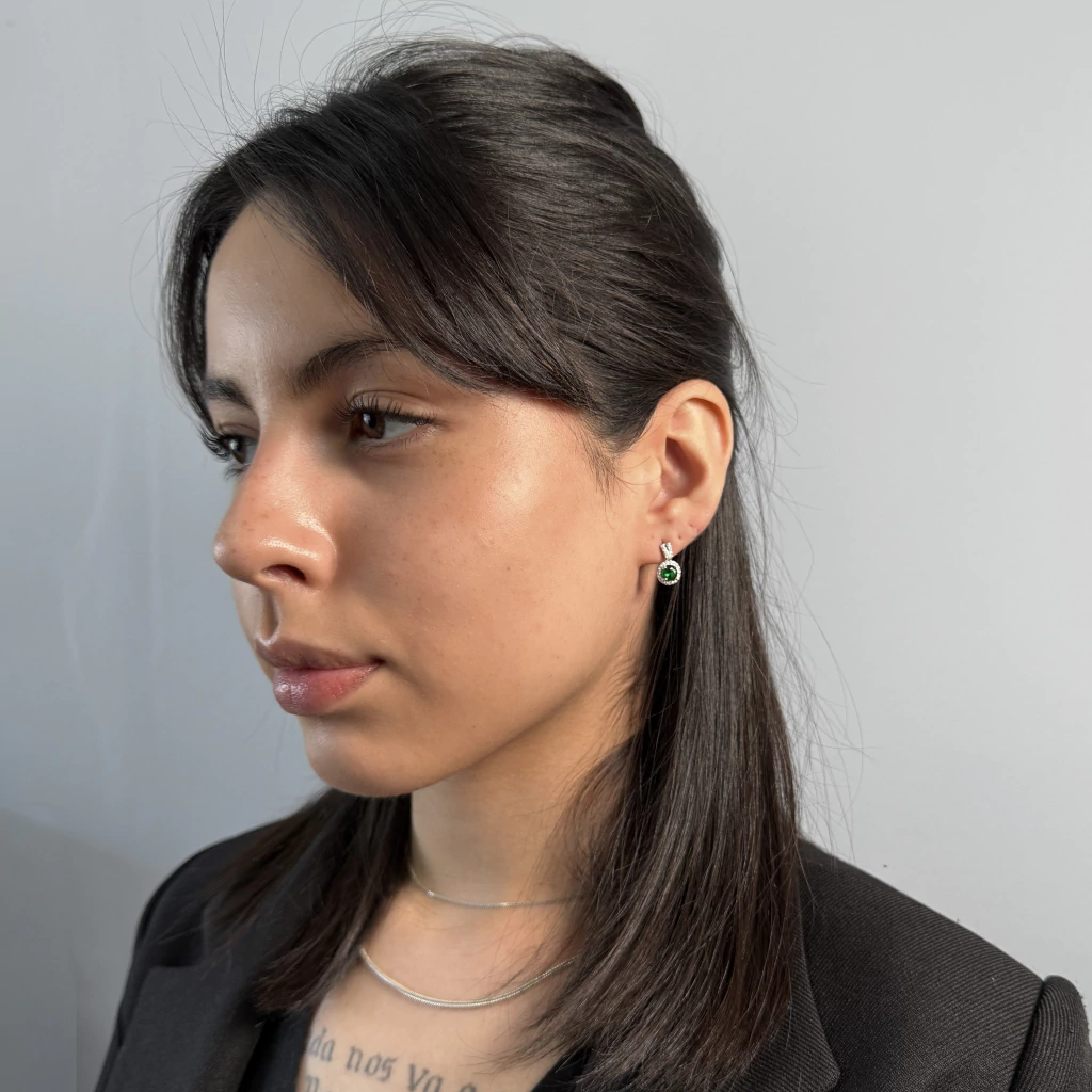 El brillante cubic color esmeralda, delicadamente rodeado por microcubics plateados, ofrece un brillo sofisticado y un estilo inconfundible.