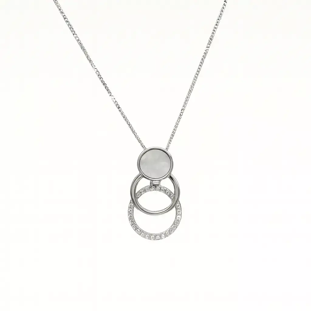 Esta cadena de plata 925 rodinada resalta por su dije de tres círculos entrelazados, decorados con un delicado contraste entre nácar natural y destellos de micro cubic zirconia.