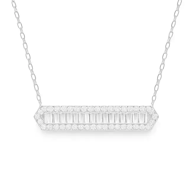 Descubre la elegancia de la Cadena Eira. Esta cadena de plata 925 rodinada, con un detalle de barra de 3,5 cm adornada con cubic zirconia en forma de baguette, es el accesorio ideal para realzar cualquier atuendo.