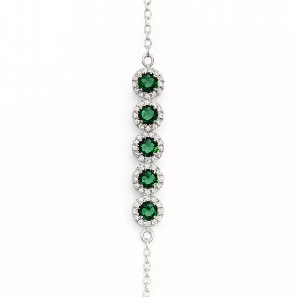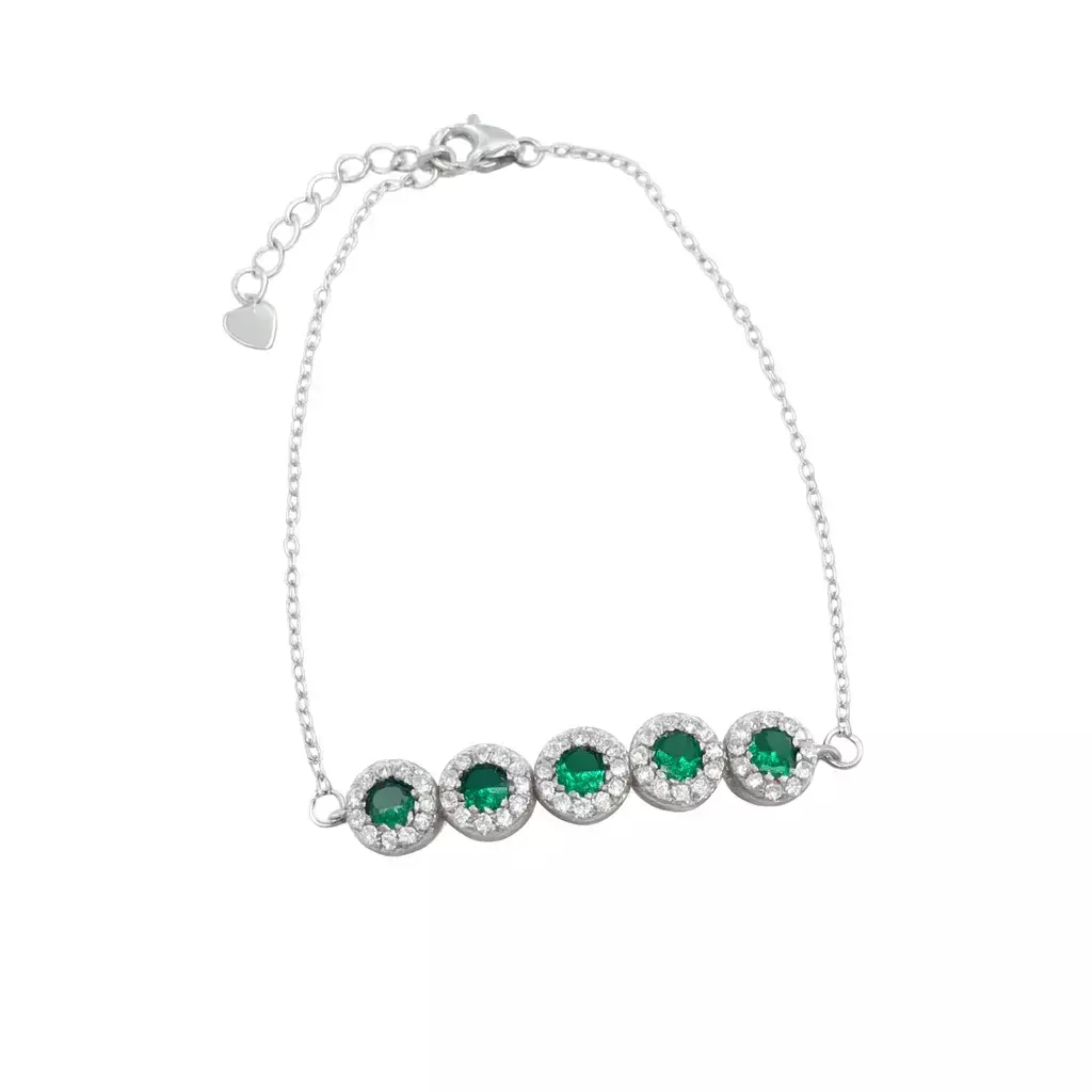 Esta pulsera presenta un engarce de cubics en color verde, cuidadosamente rodeados por microcubics plateados, que le aportan un brillo sutil y elegante.